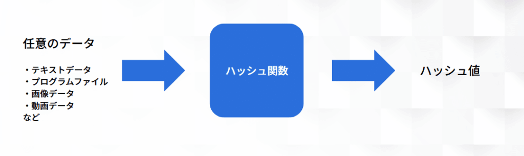 ハッシュ関数とは、テキストファイルや画像データ、動画データなどさまざなな任意のデータから、予め定められたルールに乗っ取って値を出力する関数のことです。ここで出力された値のことをハッシュ値といいます。