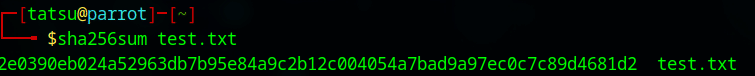 下記の例は、Linux上でSHA-256の処理を行うためのコマンドである「sha256sum」を使って、テキストファイルである「test.txt」のハッシュ値を求めたものです。結果が256ビットで表示されているのがわかるかと思います。